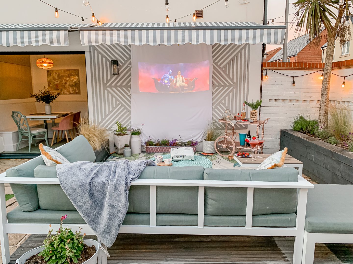 - Bring the indoors outdoors with cosy blankets, cushions and perhaps bean bags or floor cushions for extra warmth and comfort.