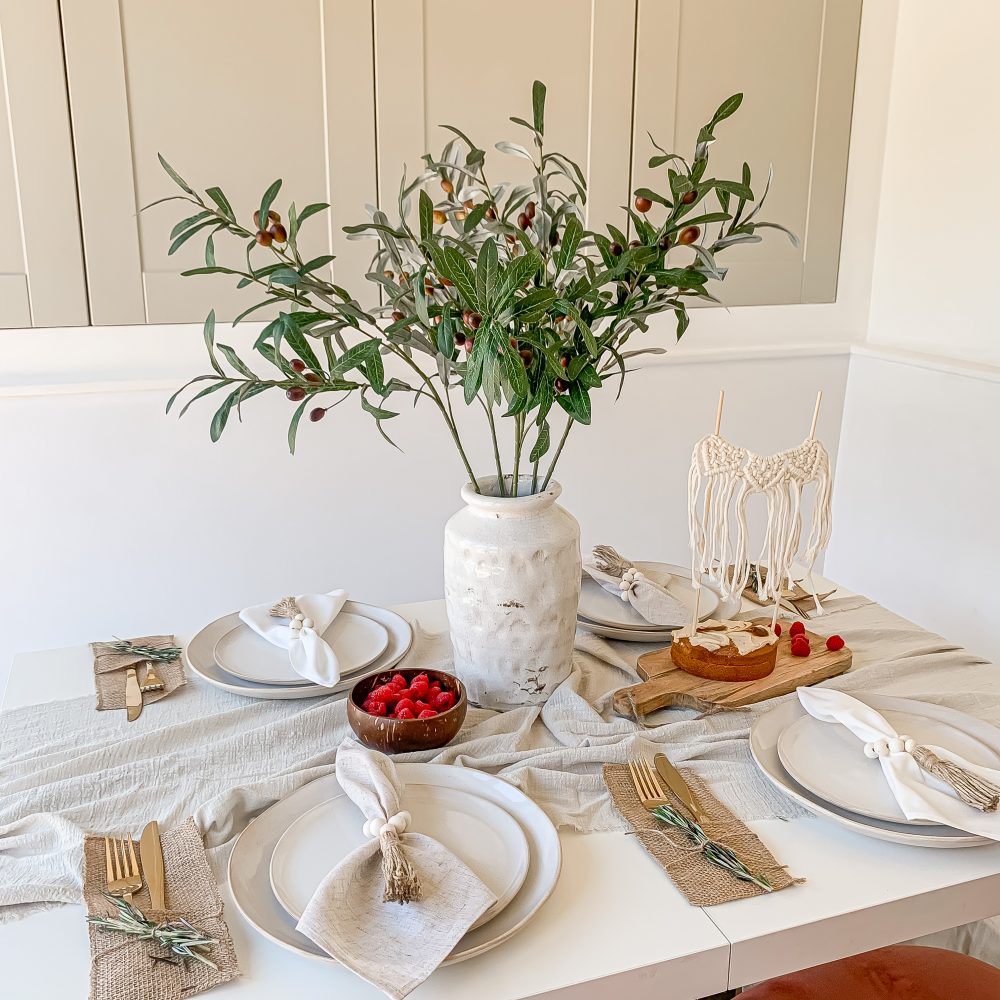 Think pampas grass for boho and neutral lovers, sprigs of olive branches, twisted willow or cherry blossom for a farmhouse chic vibe, or lots of different wild flowers picked from the garden for shabby chic and country cottage homes.
