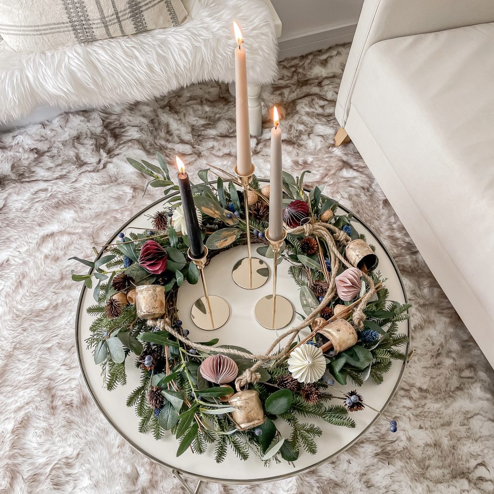 Create a show-stopping centrepiece with our green foliage wreath, gold or black taper candlesticks and cowbells garland, which works dual purpose with your front door too!