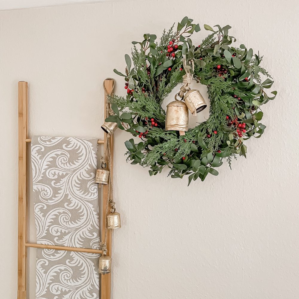 A gorgeous wreath on the front door and an inviting hallway will instantly make guests feel festive and welcomed to your home, which is what the modern farmhouse Christmas trend is all about!