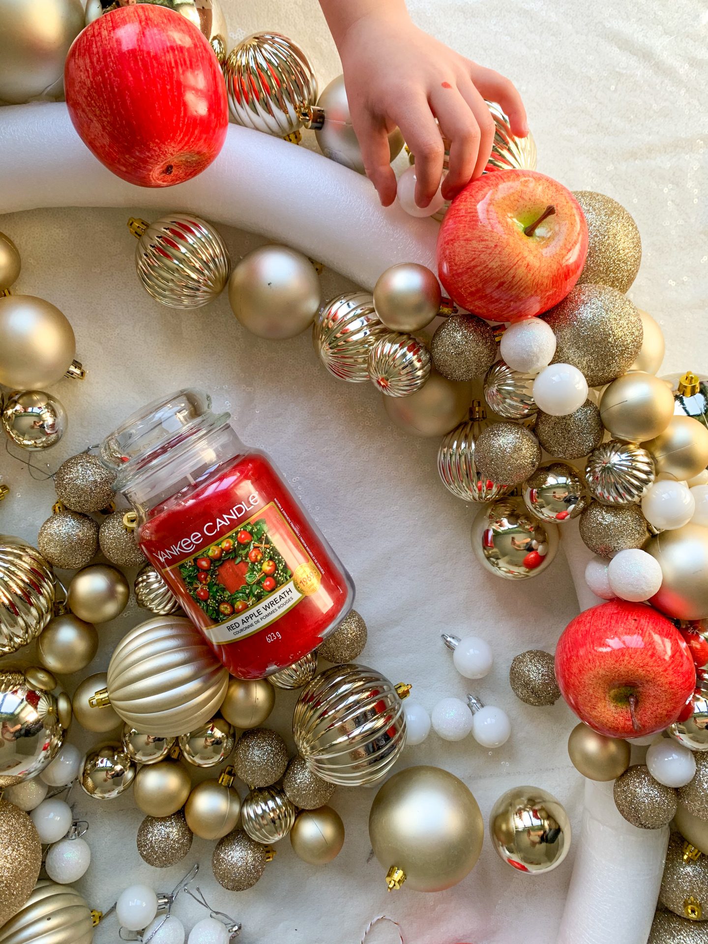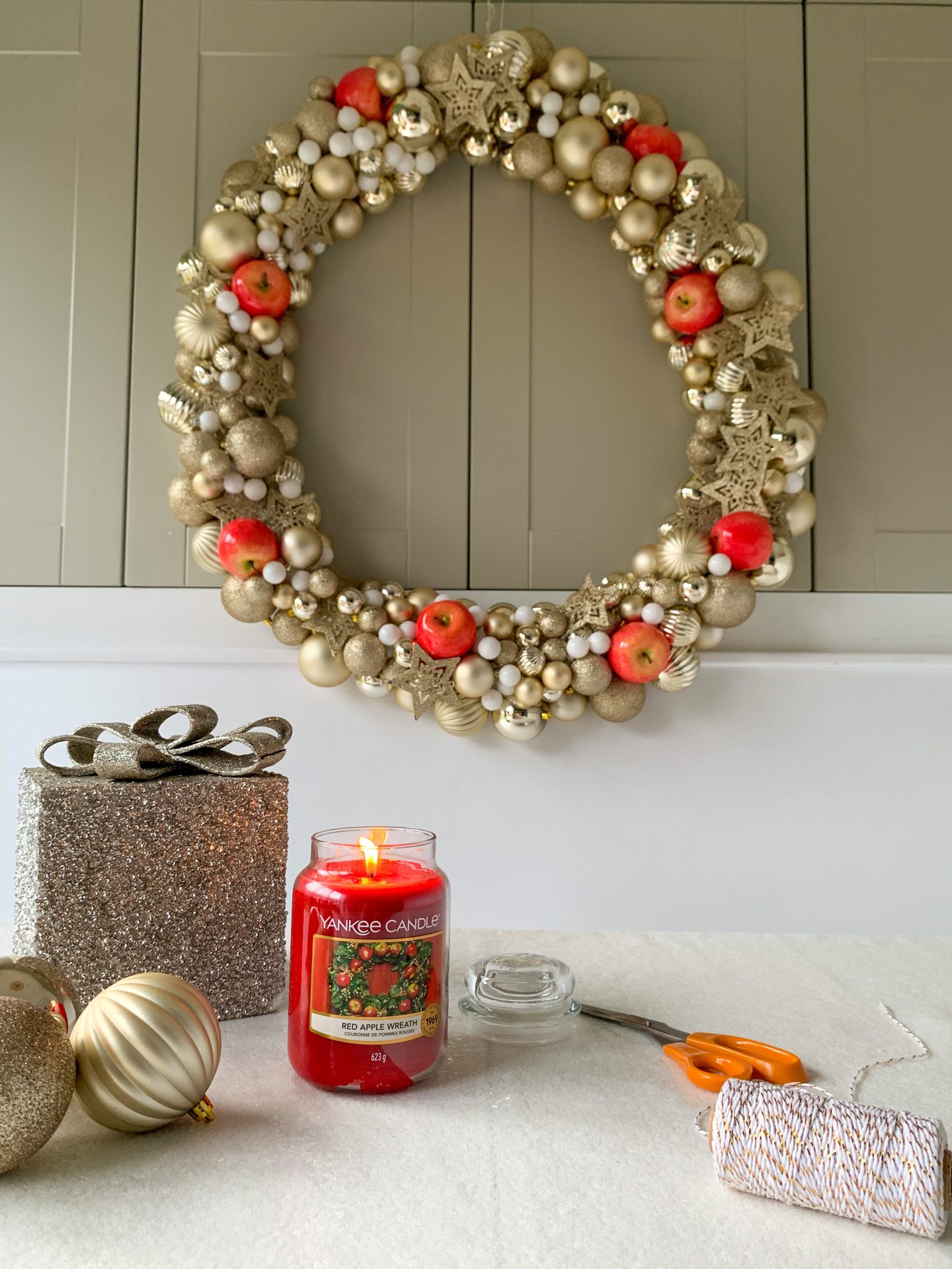 Baubles of different sizes and textures was the key to creating a balanced interesting wreath with plenty of depth and decadence. I love how the red apples bring a pop of colour…and mimic the Yankee Candle Red Apple Wreath design too of course!