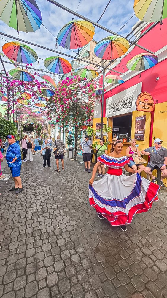 Our first island stop was the Dominican Republic. We set off on foot and made our way into the old town, soaking up the local energy along the way. One of the highlights was walking beneath the vibrant umbrella street, with music playing in the background and colourful artwork brightening up every corner. At one point, we found ourselves holding a parrot—a fun, unexpected moment that added to the festive vibe – at a cost of course!