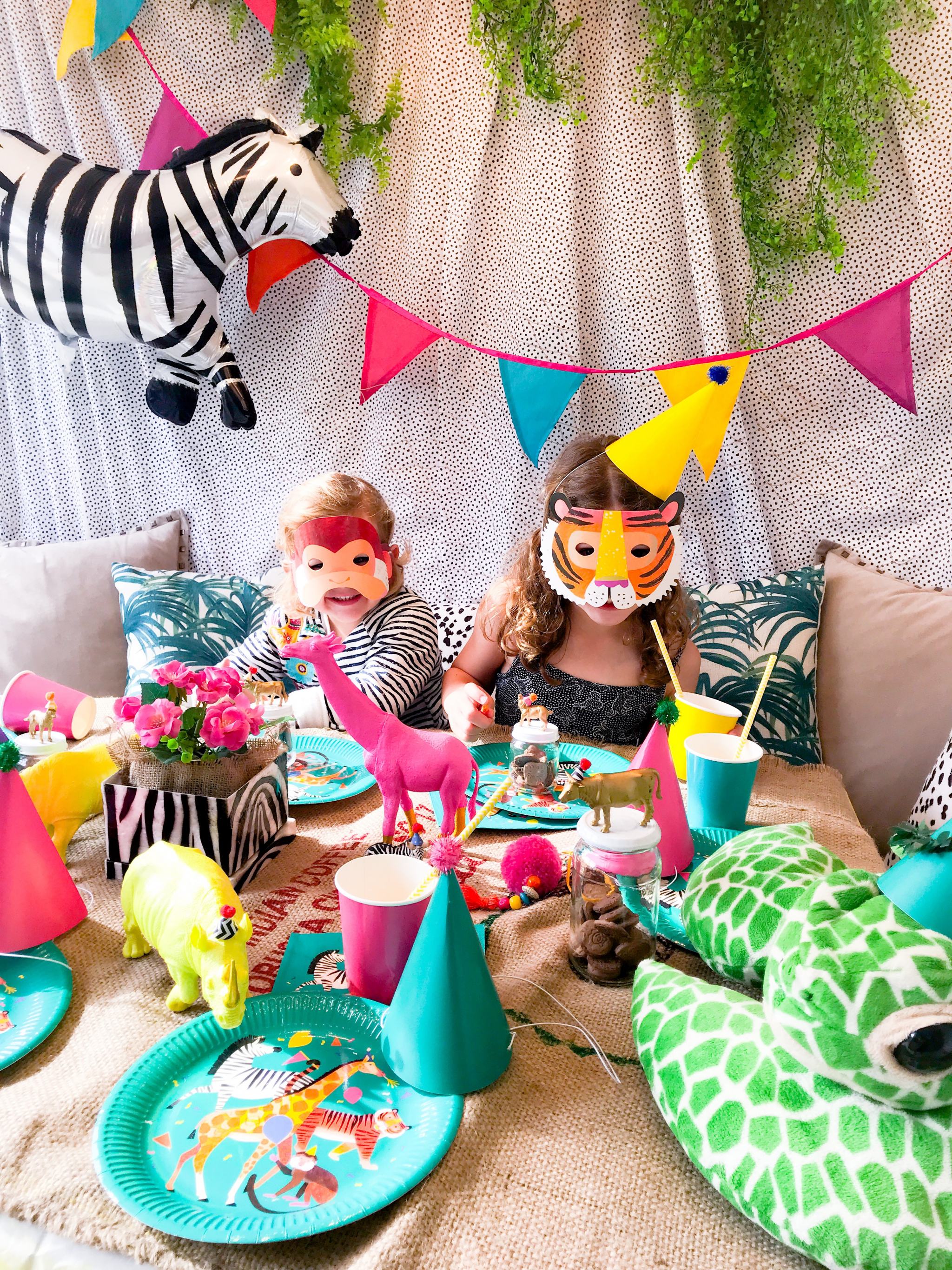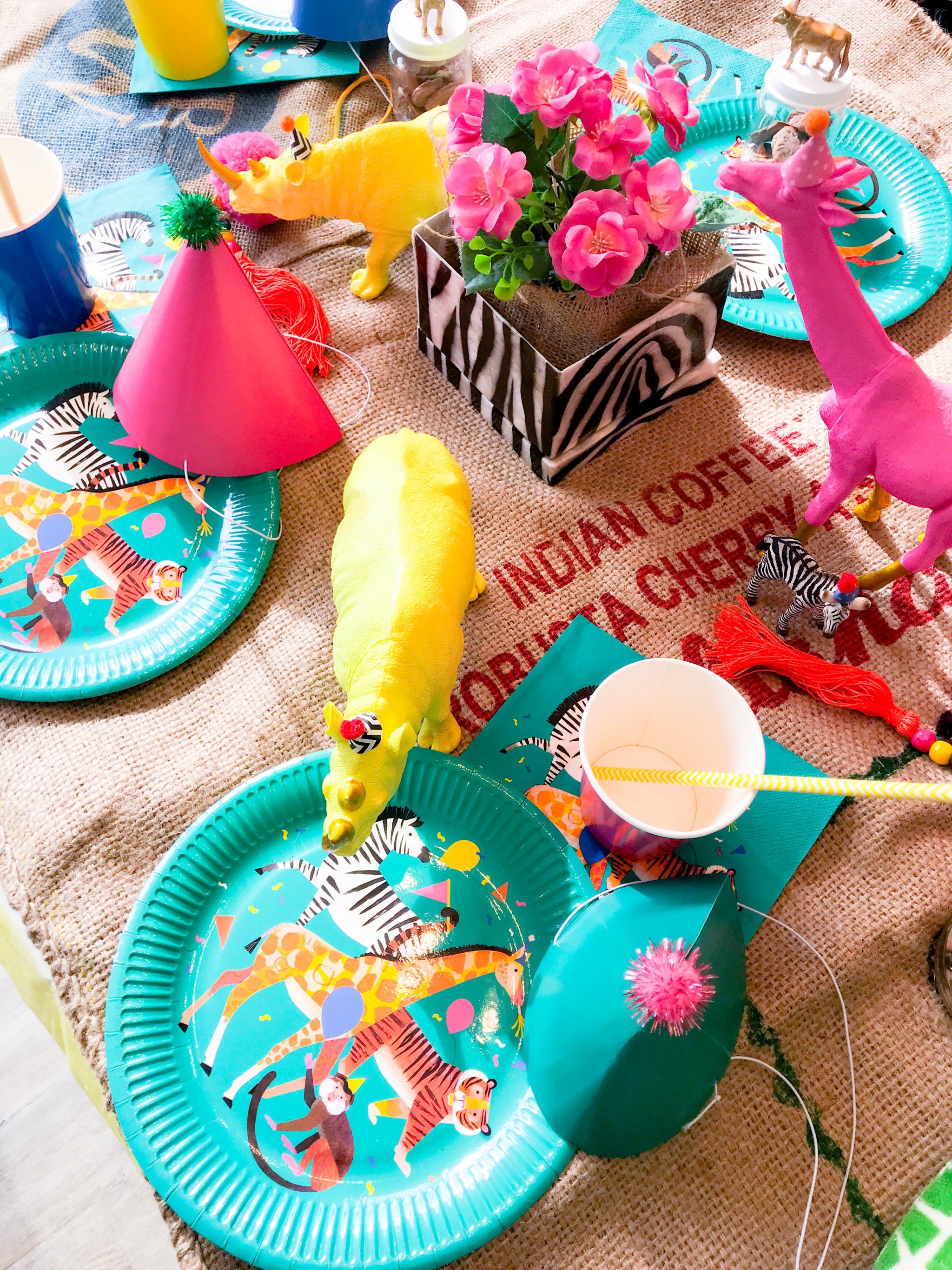 Our hessian sacks came in handy yet again (see our Boho Fiesta) to add some jungle charm to the table, as did our zebra print box from Homesense (it usually lives in our guest room) which looked perfect as a vase for the pink flowers.