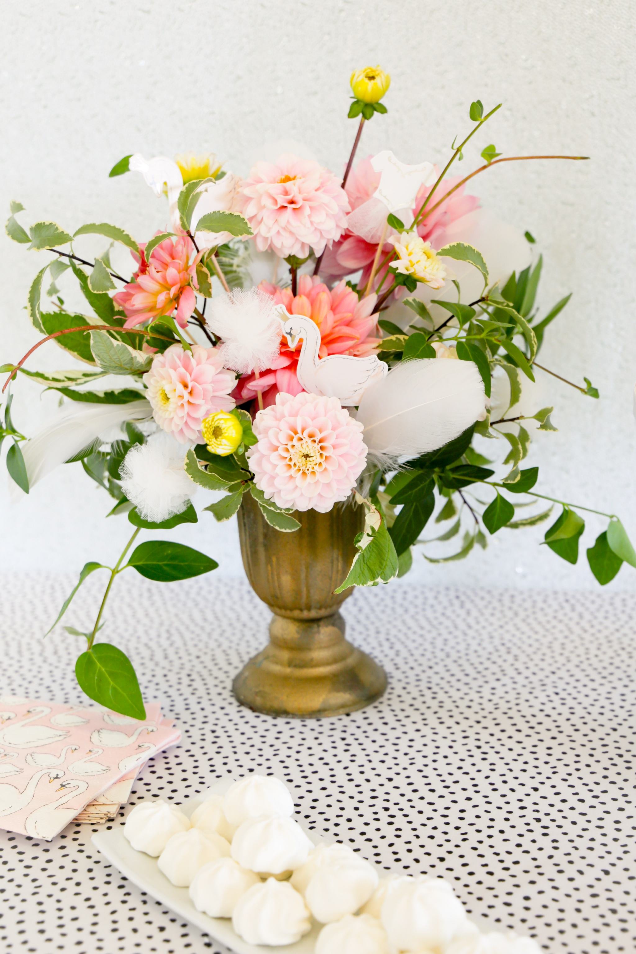 The tableware and decorations were courtesy of my good friends at Talking Tables, including the gold fringe curtain, cake toppers used in the flowers, incredible swan garlands, swan topped cake stand, pink ombre tablecloth, plates, cups and adorable swan serviettes.
