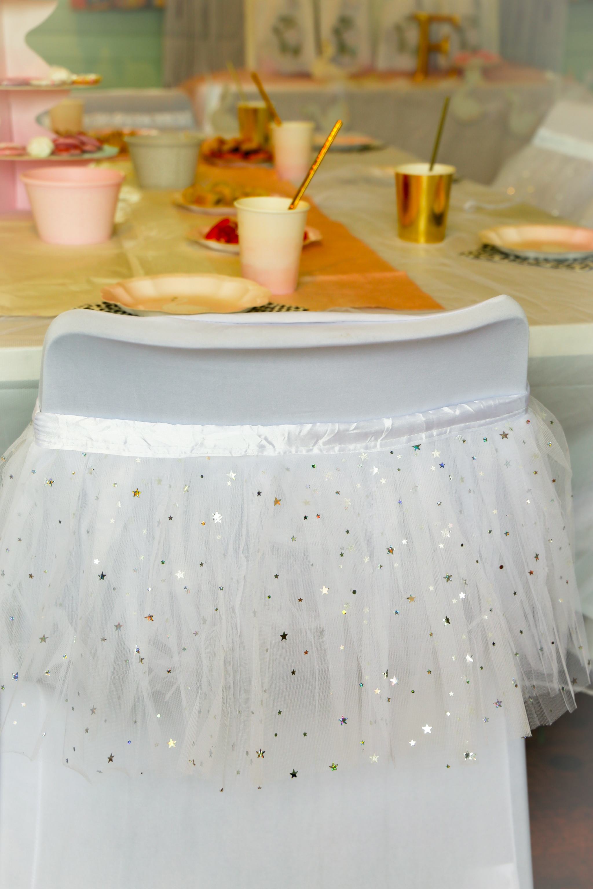 The chair covers have come in so handy and help to neutralise any space. They looked fabulous at Isla’s Ice Cream and Slime Party and completely wonderful here adorned with sparkly star tutus courtesy of Kids Birthday Bonanza. Even better that all guests got to take a tutu home!