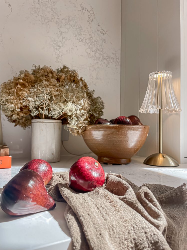 To lean into the woodsy feel of your home, consider adding some fruits or foraged branches. Pumpkins are obviously heavily associated with fall and my favourites are the whites, however, you can curate bowls of other fall fruits like figs, cranberries, conkers and apples. I love the deep plum and brown tones as well as the obvious orange.