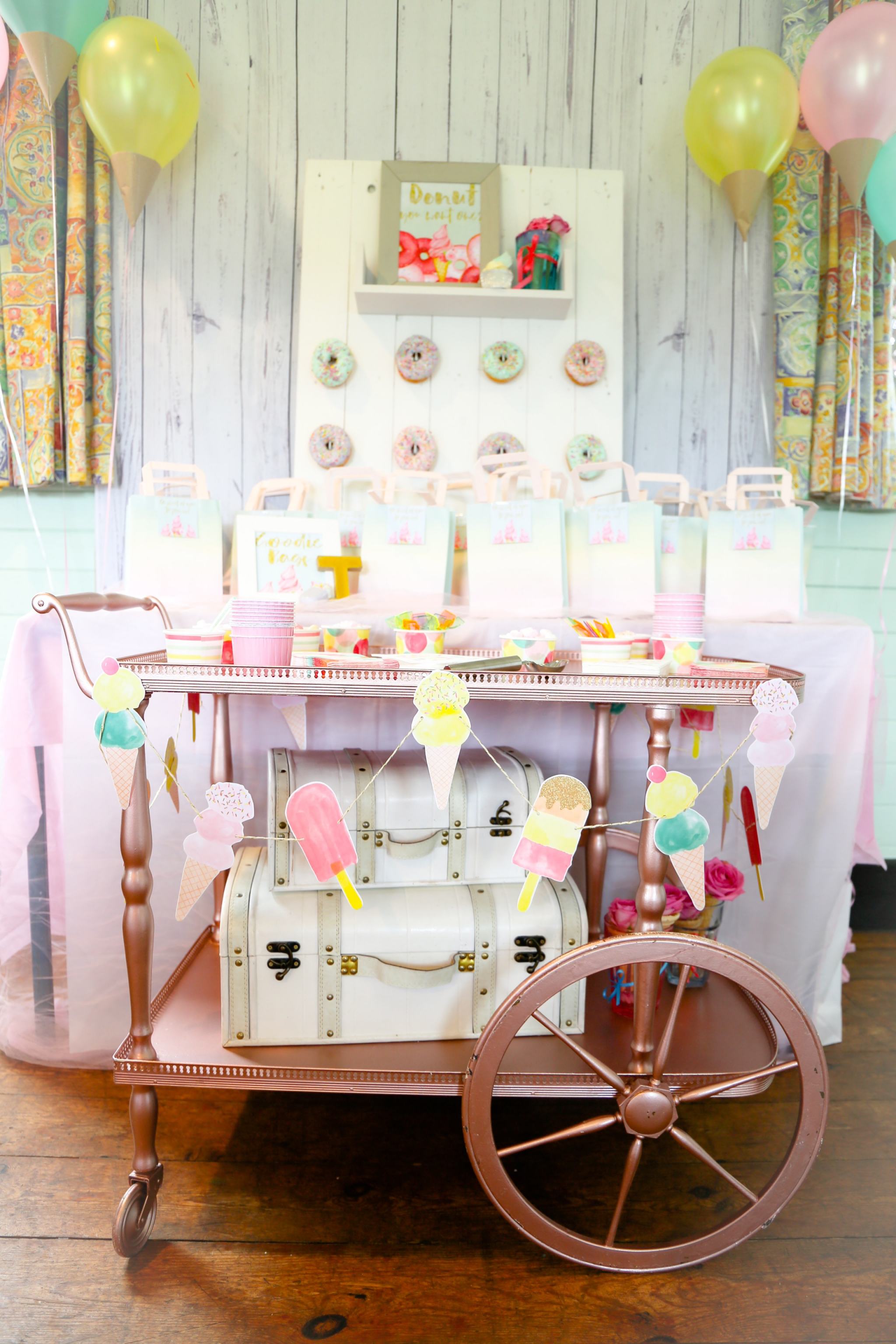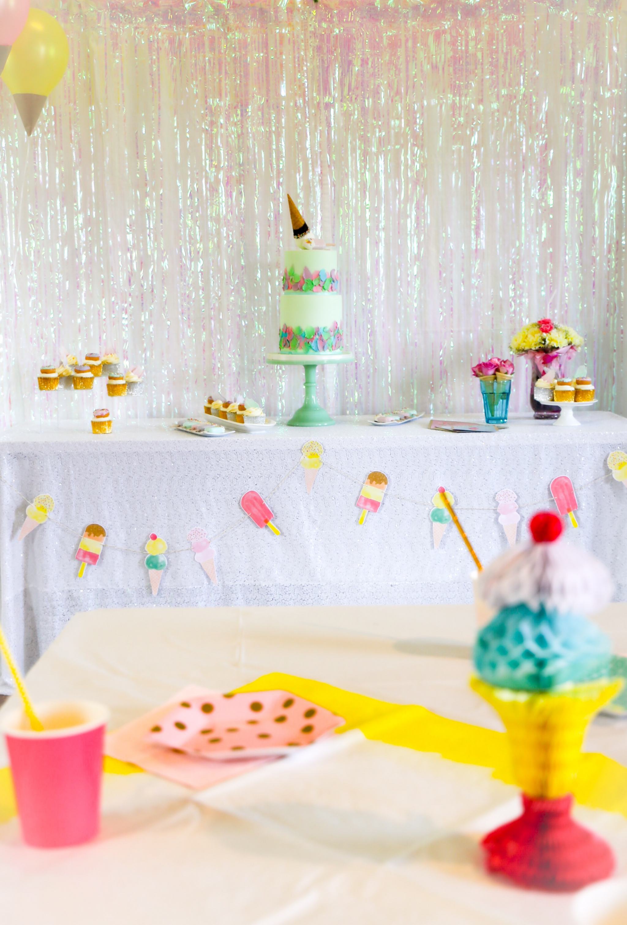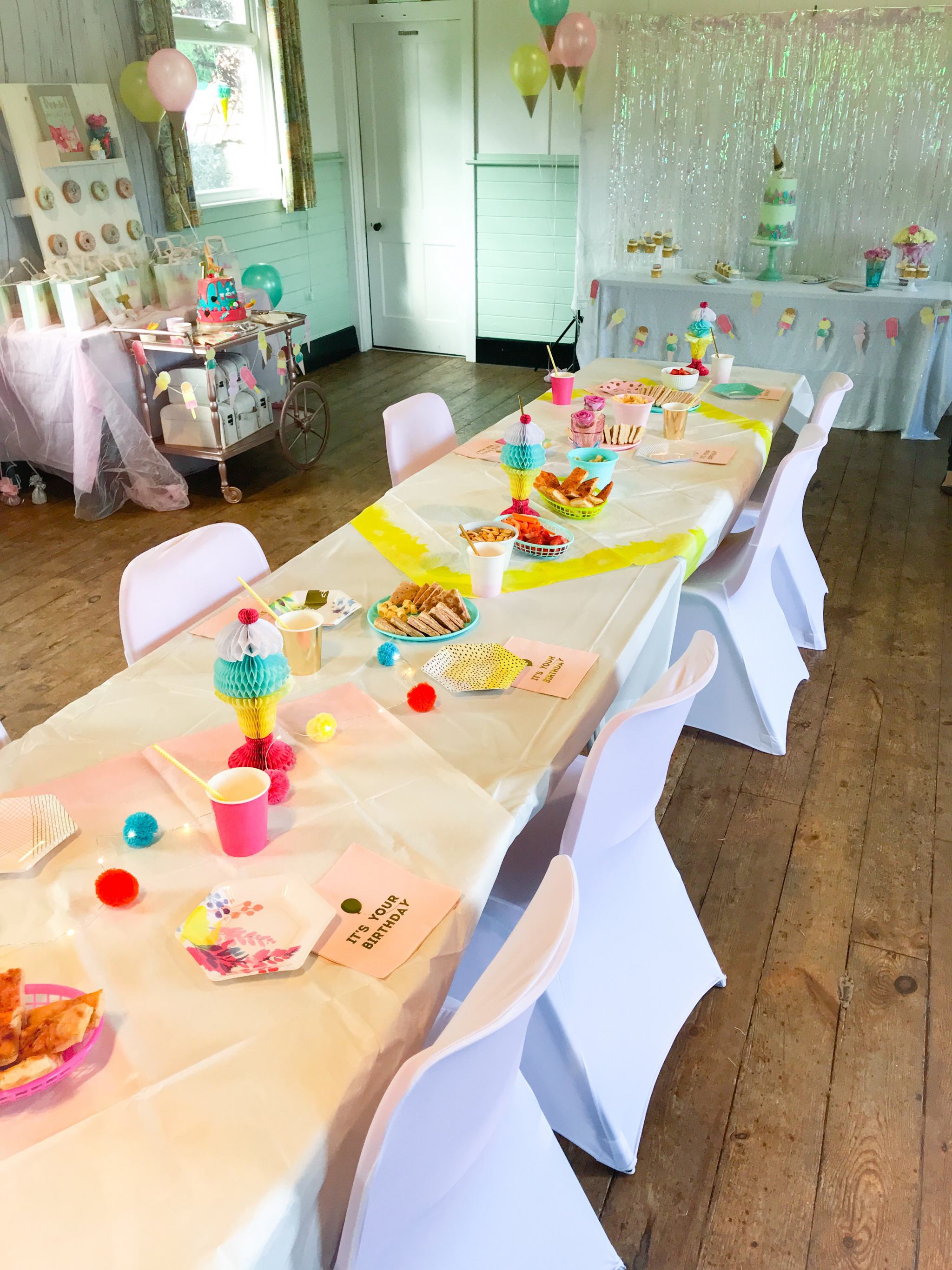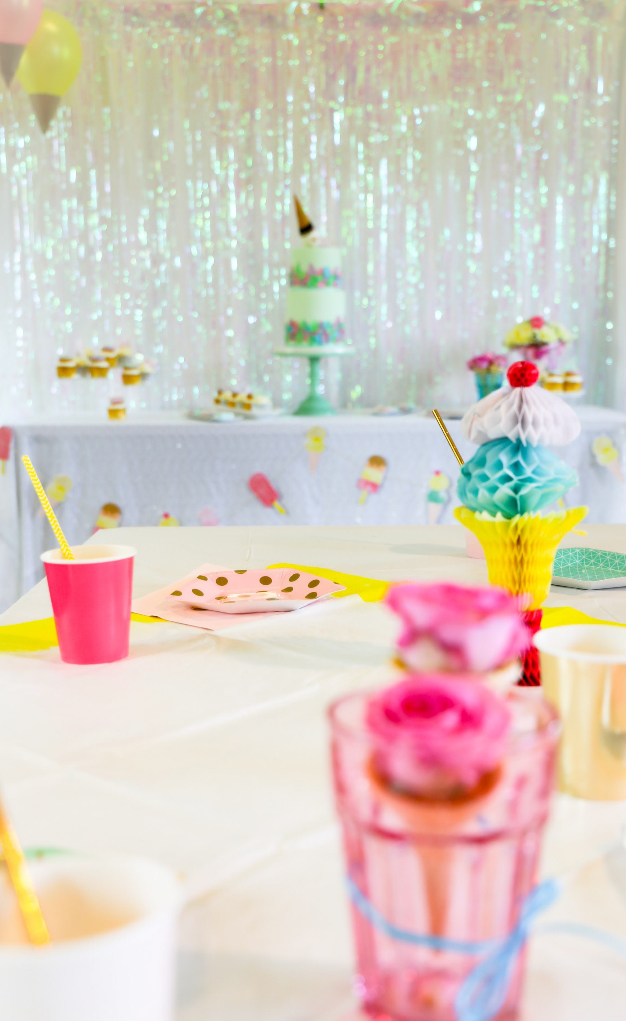 The tableware and decorations were courtesy of my good friends at Talking Tables, including the iridescent fringe curtain used for the backdrop, ice cream garlands, party bags, coloured tablecloths, plates, cups, serviettes and honeycomb sundae decorations.