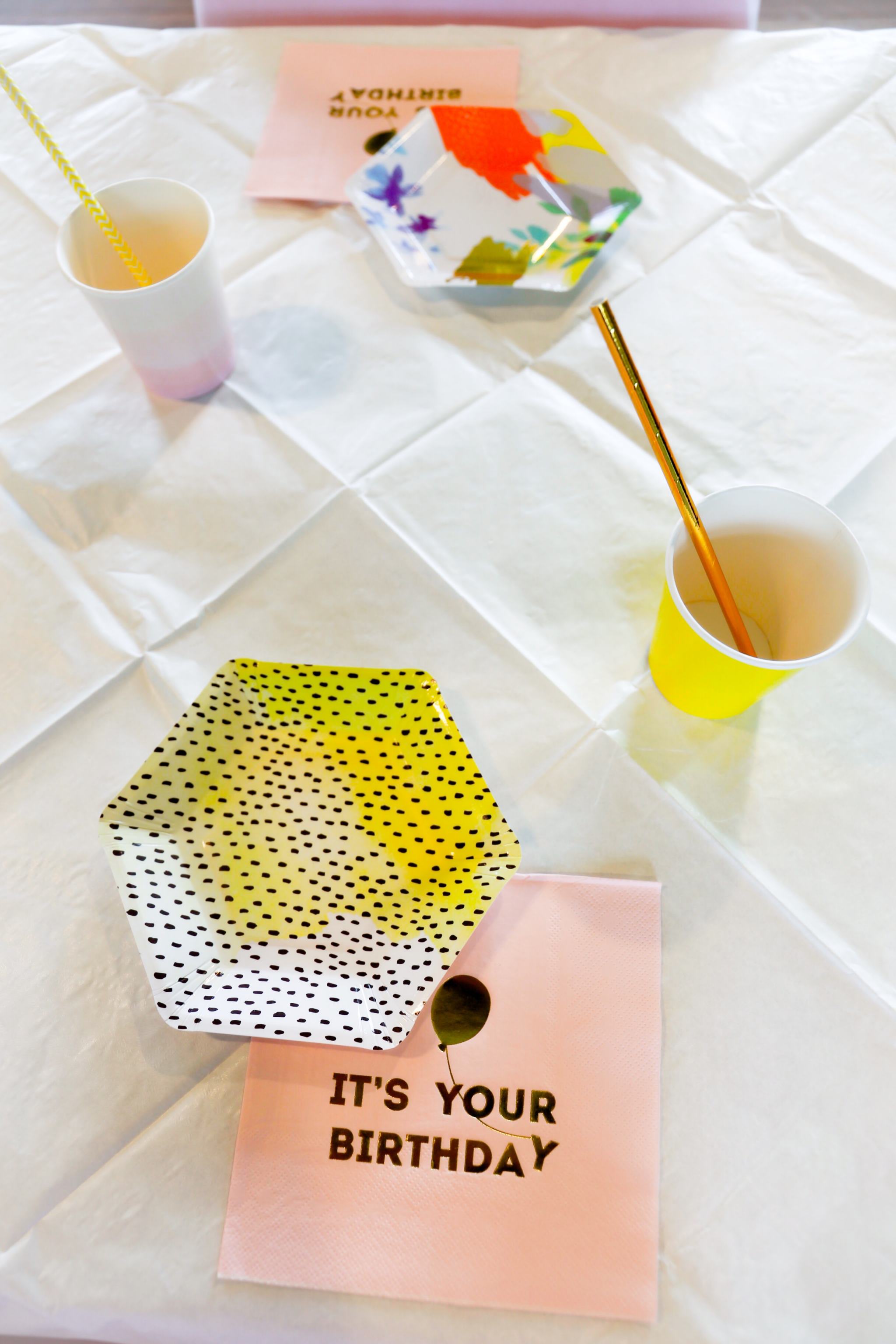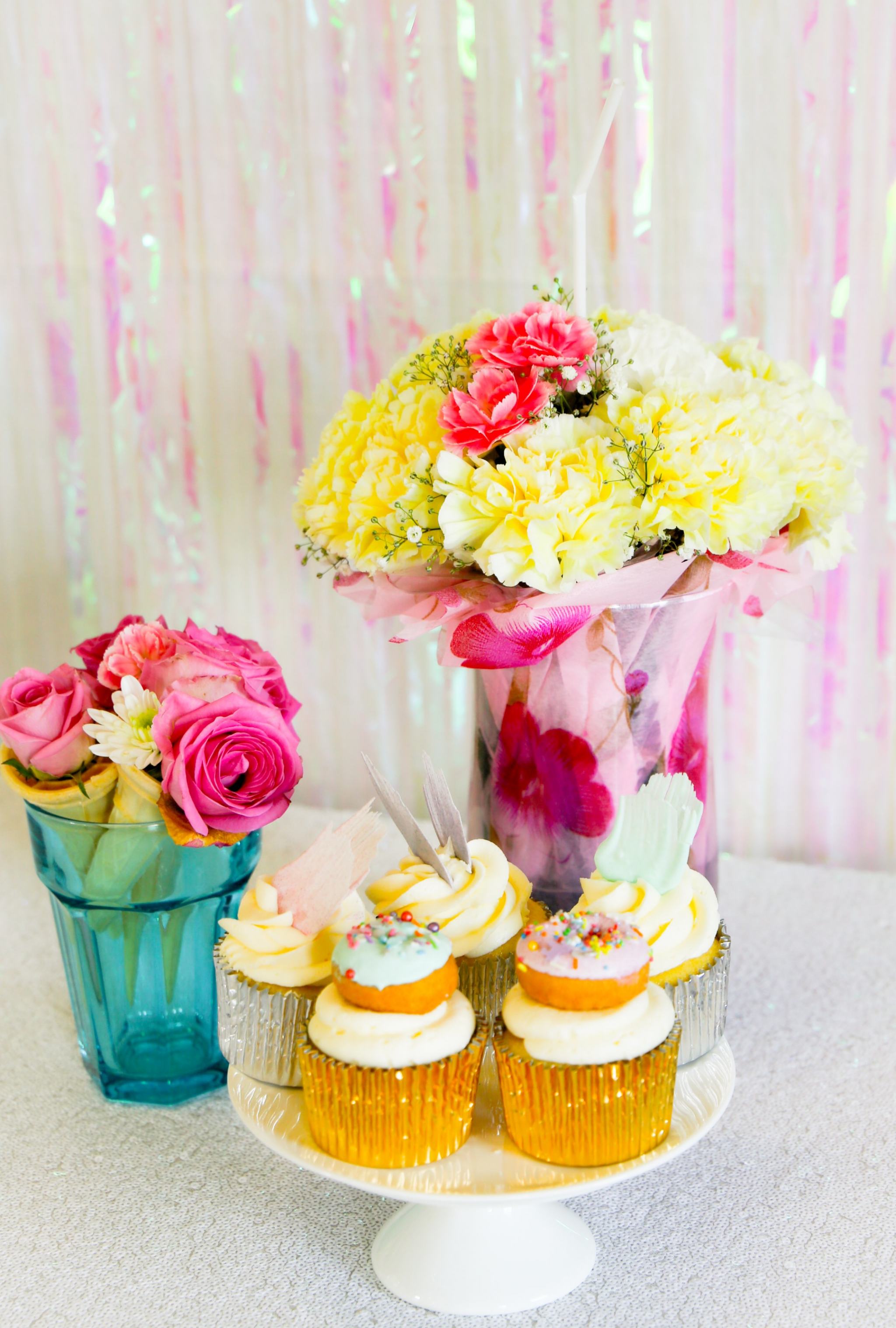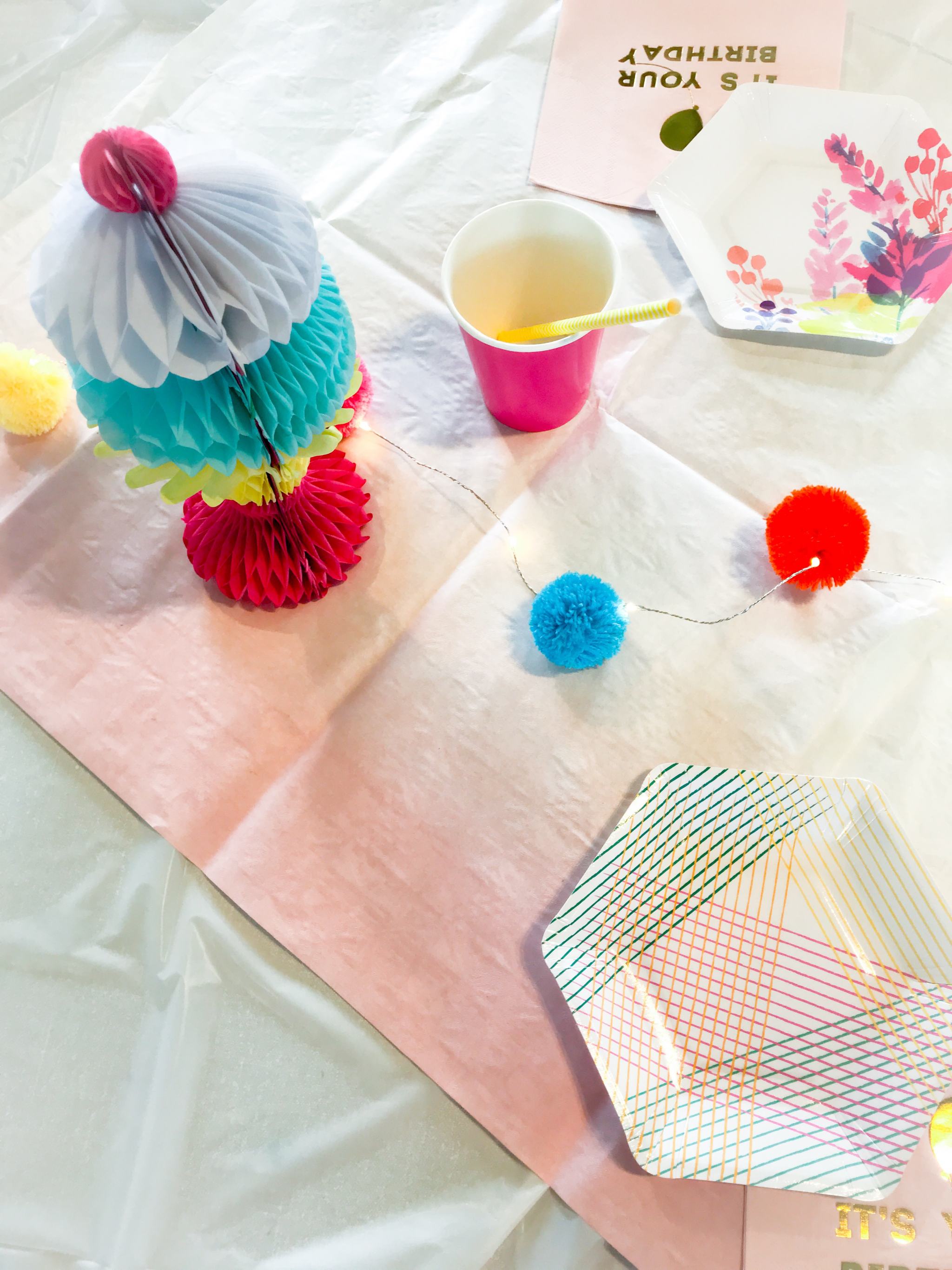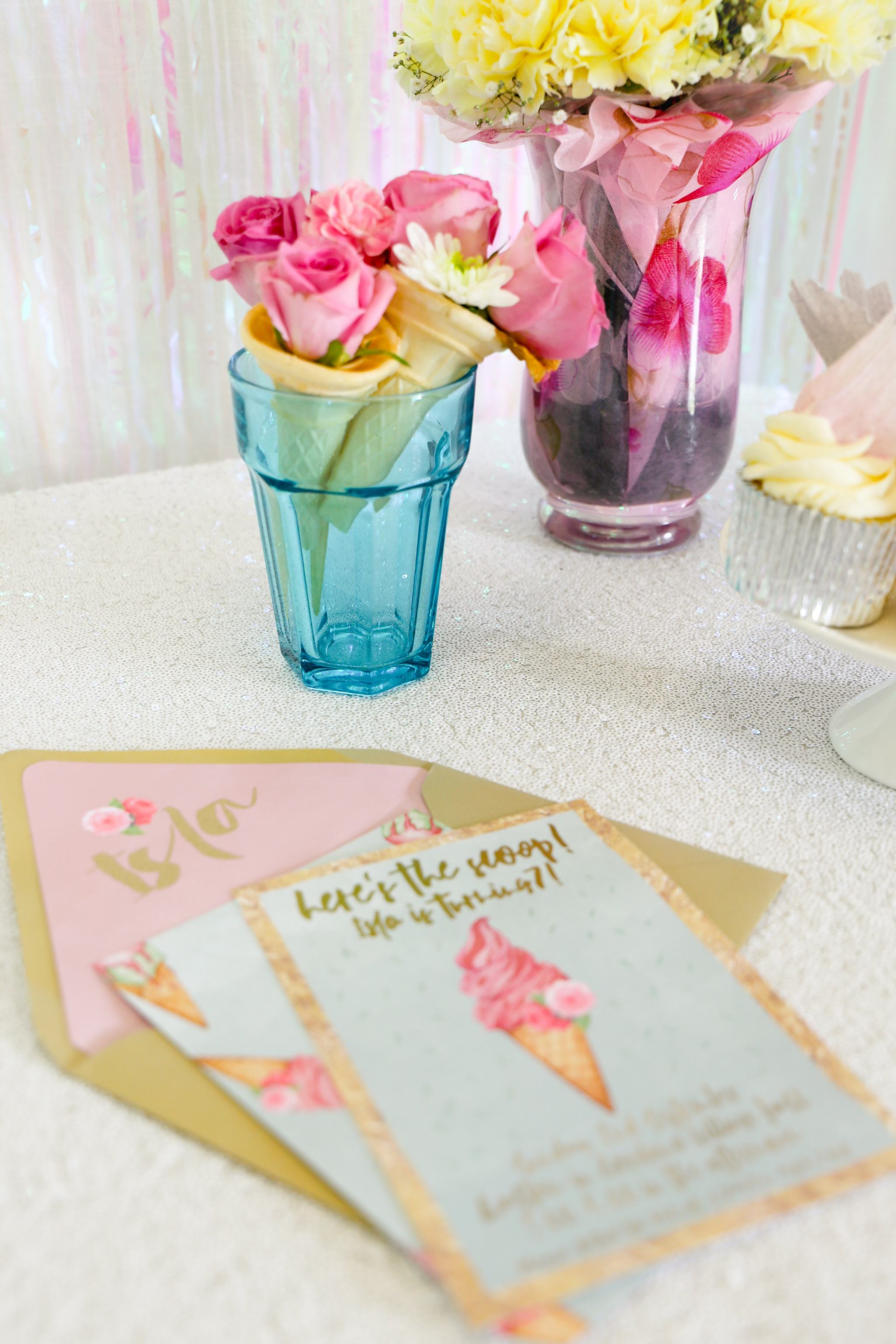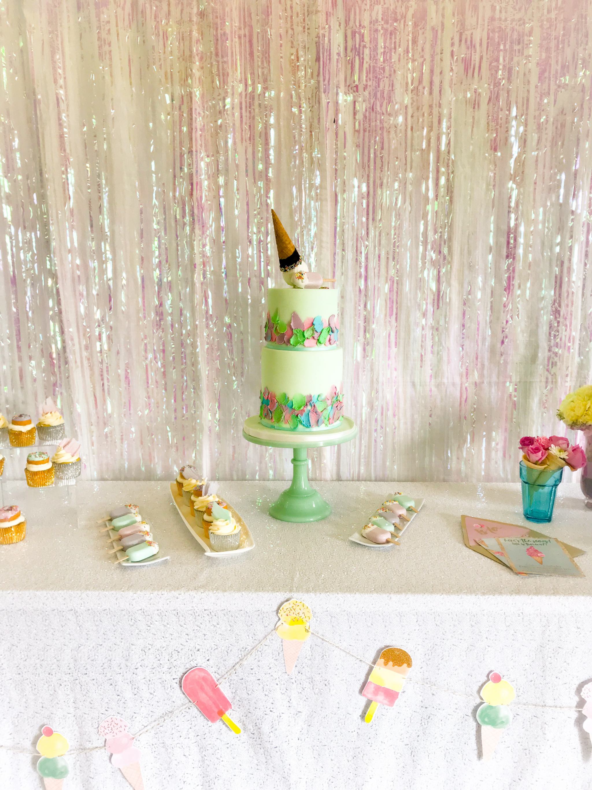 The tableware and decorations were courtesy of my good friends at Talking Tables, including the iridescent fringe curtain used for the backdrop, ice cream garlands, party bags, coloured tablecloths, plates, cups, serviettes and honeycomb sundae decorations.