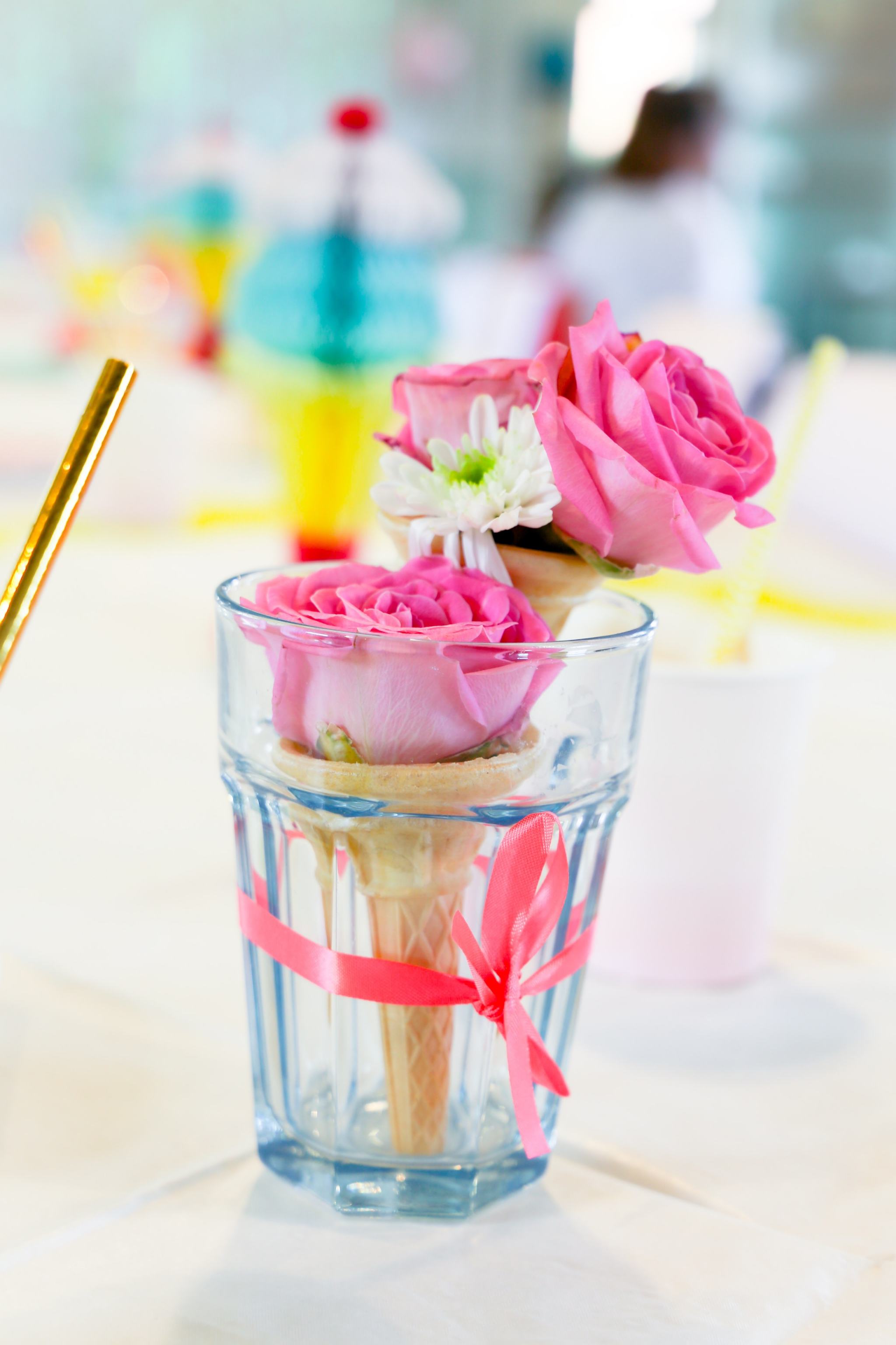 You know when you connect with someone who shares as much excitement as you do for something? Jess at Secret Garden Flowers in Axbridge is that little collaboration gem so I couldn’t wait to see how she interpreted our idea to create ice creams and sundaes from flowers after being inspired on Pinterest. Aren’t they simply adorable?! From the roses in ice cream cones (the stems were placed in water in a plastic pipet inside the cone) to the big sundae complete with pink carnation cherries and white straw, it’s all picture perfect.
